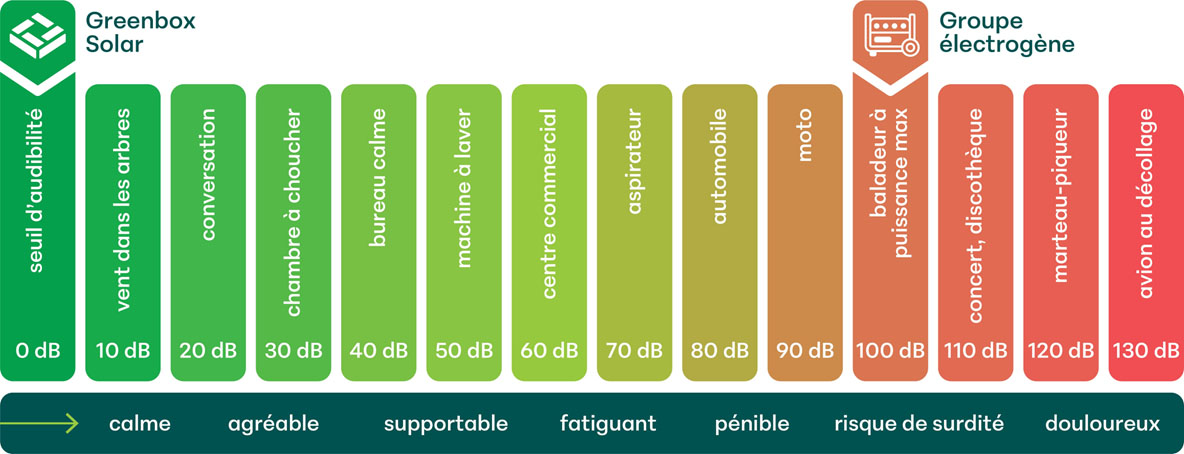 Lorsque vous choisissez une source d’énergie, le niveau sonore est un facteur essentiel pour garantir un environnement de travail agréable et serein. La Greenbox Solutions offre une solution silencieuse, fonctionnant à un niveau proche du silence absolu (0 dB), bien en dessous des bruits habituels du quotidien comme le vent dans les arbres (10 dB) ou une conversation normale (20 dB).