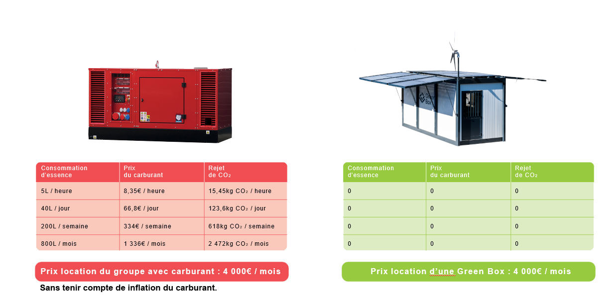 Dans un monde où la réduction des émissions de CO₂ est essentielle, chaque choix compte. La comparaison est claire : le groupe électrogène traditionnel, avec une consommation de carburant élevée et un rejet de CO₂ important, coûte non seulement cher en carburant, mais impacte également notre environnement. À l'inverse, la Green Box, solution écologique et sans émissions, offre une alternative propre et économique, idéale pour ceux qui souhaitent allier performance et respect de la planète.